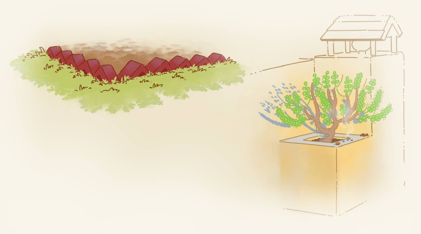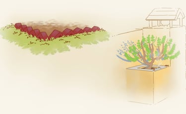 STAIR ARRANGEMENT OF BRICKS AROUND GARDEN AND THE SACRED TULSI PLANT
